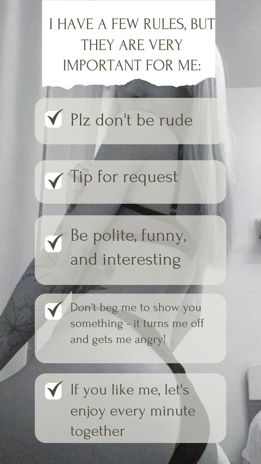 Ahegao, Dirty Talk, Erotic Dance, Heels, Smoking, Topless, Spanking, Cock Rating, anal+400, squirt+400, DP+800, Blowjob, Camel Toe, Fingering, Flashing, Masturbation, Sex Toys, Twerk, Tittyfuck, anal+250, squirt+250, Dildo or Vibrator, Foot Fetish, Handjob, Jerk-off Instruction, Orgasm, Striptease, Role Play, Deepthroat